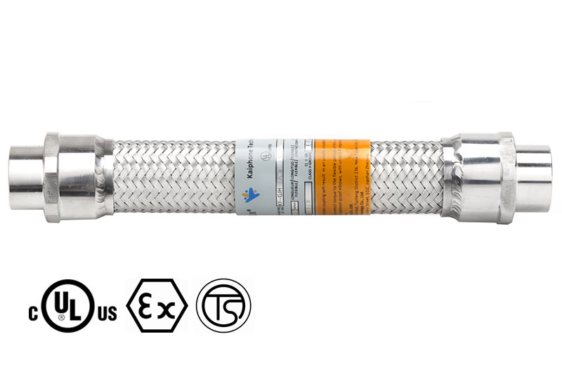 UL / IECEx 防爆金屬軟管,隔爆防塵型,兩端接頭內螺紋型式 KF--GJH-F 系列,整體結構密封不泄露,通過 UL 及 ATEX / IECEx 防爆標準的測試取得認證,管身柔軟耐彎折,且耐壓防爆,同時具備減震功能,適用于短距離,空間狹窄或長期震動部位的電氣線路保護,為安裝于危險環境或具有潛在爆炸風險場所中的電氣設備提供堅強,高安全性的保護,共同維護高風險環境中的設施安全,大幅降低意外損失。隔爆防塵型防爆軟管組為不銹鋼材質,考慮安裝需求,兩端接頭有內牙與外牙兩種型式可供選擇搭配。